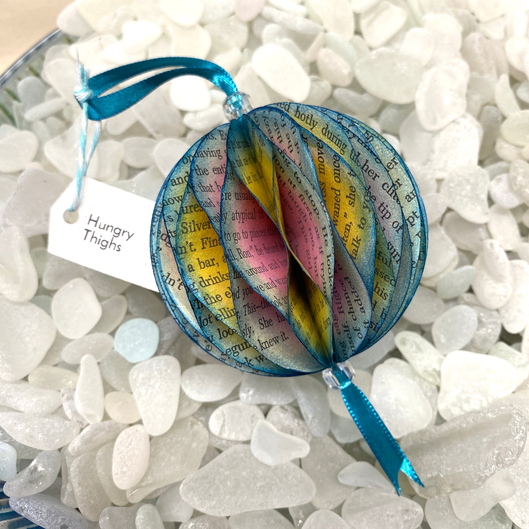 These saucy, hand-colored pretties are made from the pages of Hungry Thighs, a 1972 pulp porn novel by Peter Sukhov, and are fixed with Czech crystal beads at the top and bottom. The old fashioned aesthetic means it will fly right under the radar...no one will know you that the phrase "Ron's pulsating cock" is hanging on your Christmas tree unless they spread the leaves and look really, really close.