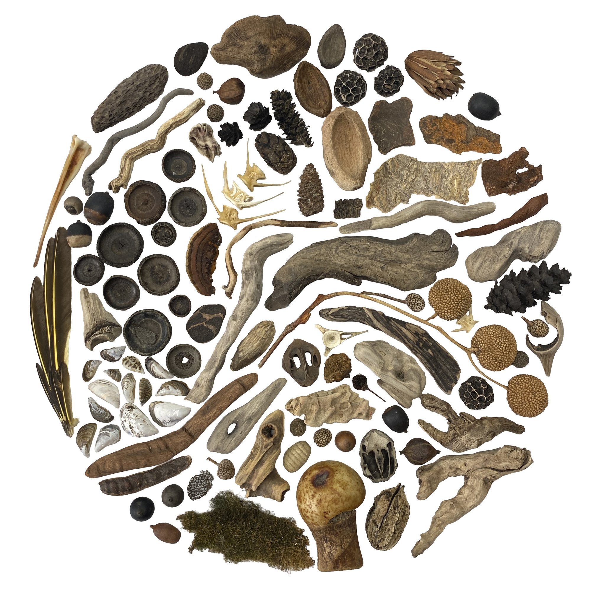 This is a signed print of a flatlay I composed in 2025, entitled Meditation: Au Naturel. It is composed entirely of natural items I collected on a single, small Lake Erie beach.