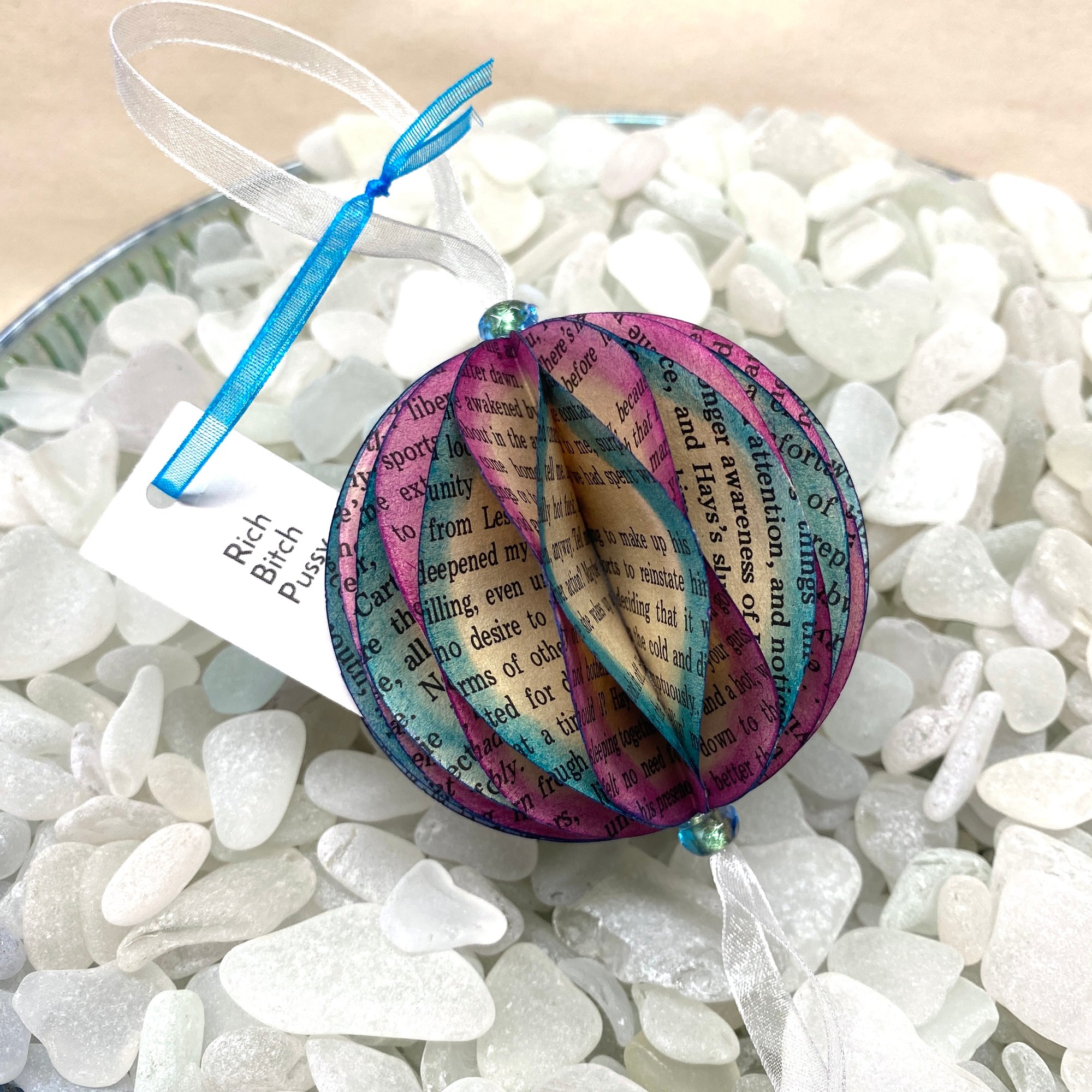This saucy, hand-colored orb is made from the pages of Rich Bitch Pussy, an early-80s pulp porn novel by Evan Cain, and is fixed with Czech crystal beads at the top and bottom. The old fashioned aesthetic means it will fly right under the radar...no one will know you that the phrase "lava hot juices" is hanging on your Christmas tree unless they spread the leaves and look really, really close.